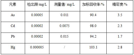 在碰撞反應(yīng)模式下,以內(nèi)標法校正儀器信號漂移,將配制好的各元素標準溶液上機測試,繪制標準曲線,各元素標準工作曲線線性相關(guān)系數(shù)R>0.999;對樣品空白溶液平行測定11次,計算11次樣品空白值的標準偏差,并以三倍標準偏差/工作曲線斜率表示檢出限;間隔2min,對樣品平行測定7次,計算7次測試結(jié)果對應(yīng)的相對標準偏差,表示精密度;對樣品進行加標實驗,并計算加標回收率。各元素檢出限為0.000005~0.00005mg/L,加標回收率為90.4%~103.1%,精密度為1.7%~3.5%。