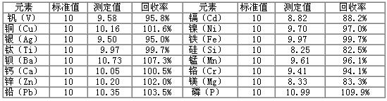 采用本方法測試潤滑油金屬含量光譜分析標(biāo)準(zhǔn)物質(zhì)GBW(E)130129、GBW(E)130132,對比實際測定值與標(biāo)準(zhǔn)值,得出實際測試的回收率,得到準(zhǔn)確度數(shù)據(jù),結(jié)果見下表