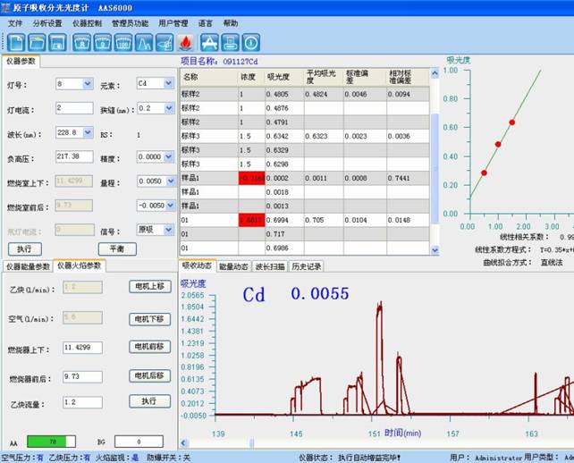 于原子吸收光譜儀 228.8 nm 處,使用空氣-乙炔貧燃火焰,以水調零,測量試液的吸光度,減去隨同試料的空白試驗溶液的吸光度,從工作曲線上查出相應的鎘濃度。