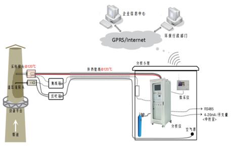 采樣探頭安裝于企業(yè)廢氣排口,排口被測廢氣被負(fù)壓抽泵抽取進(jìn)入采樣探頭探桿(不加熱),經(jīng)過陶瓷濾芯進(jìn)入伴熱管線(伴熱溫度可設(shè)置),樣氣在伴熱管中繼續(xù)傳輸至預(yù)處理系統(tǒng),在預(yù)處理系統(tǒng)經(jīng)過二級過濾和分流后按照一定流量送至在線氣相色譜儀(GC-FID)。在線氣相色譜儀控制內(nèi)置自動(dòng)取樣平面十通閥和定量環(huán)系統(tǒng)取1mL的被測樣氣,借助載氣送入色譜柱分離和FID做定性、定量分析。分析結(jié)果通過工控機(jī)保存,并和排氣筒監(jiān)測排放參數(shù)一起通過數(shù)采儀送至環(huán)保監(jiān)控平臺。